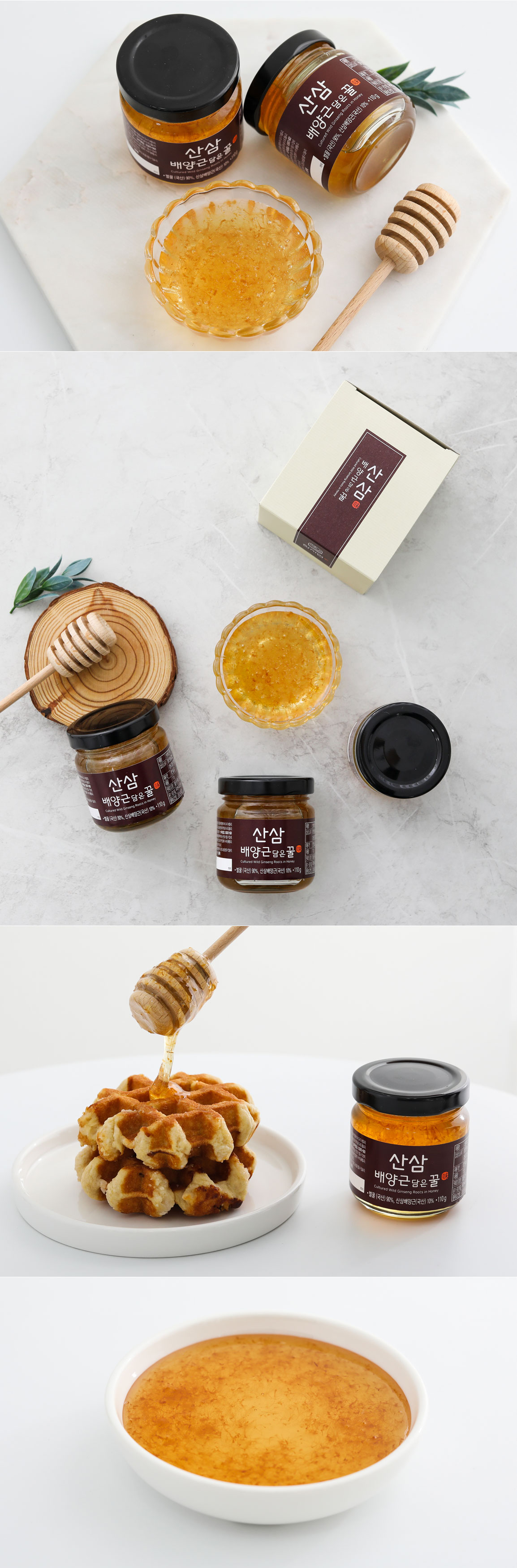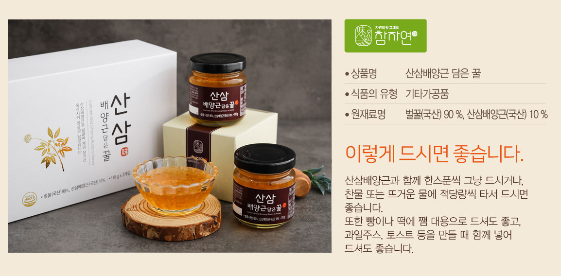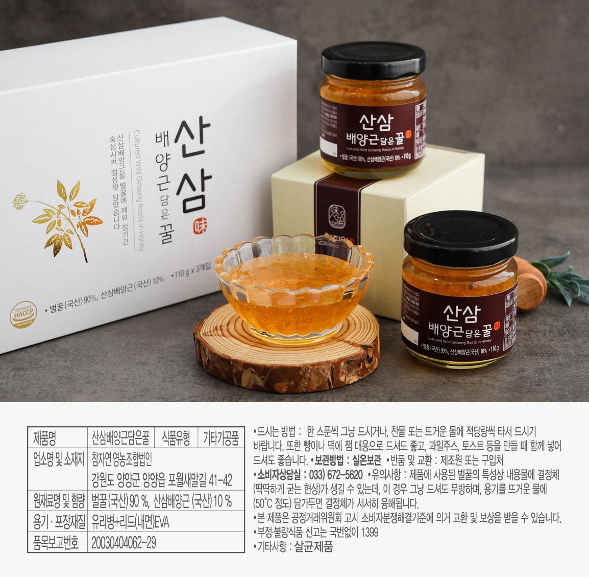 산삼배양근을 벌꿀에 재워 장기간 숙성시켜 만든 꿀로 선물용으로 좋습니다.