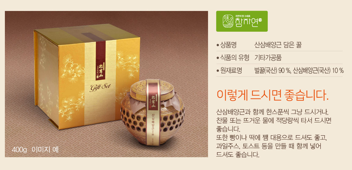 산삼배양근을 벌꿀에 재워 장기간 숙성시켜 만든 꿀로 선물용으로 좋습니다.