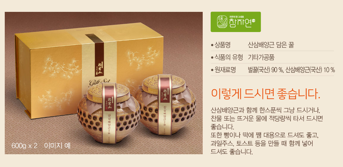 산삼배양근을 벌꿀에 재워 장기간 숙성시켜 만든 꿀로 선물용으로 좋습니다.